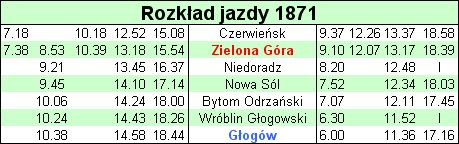 Pierwszy rozkład jazdy opracowany na podstawie cytowanej publikacji M. ZarzyckiegoW maju 1874 roku tor doprowadzono do Rzepina, w sierpniu tego samego roku oddano do użytku odcinek Wrocław - Rudna Gwizdanów przez Wołów, Ścinawę. Dlaczego pierwotnie linia zaczynała się w Legnicy, a nie we Wrocławiu, który był w tym czasie największym i najważniejszym miastem na Dolnym Śląsku. Po pierwsze dlatego, że pierwotny plan zakładał przedłużenie linii z Jaworzyny Śląskiej w kierunku morza i tu naturalnym węzłem była Legnica. Po drugie odcinek z Wrocławia do Rudnej zaplanowano tak, że w dwóch miejscach stało się konieczne zbudowanie długich mostów, co naturalnie wydłużało czas i podnosiło koszty budowy. Pierwotnie więc szlak miał większe wydłużenie niż miało być docelowo. W styczniu 1875 linia dotarła do Kostrzyna nad Odrą. 15 maja 1877 roku linia dotarła do Szczecina. Ponad 300 kilometrowy odcinek torów został ukończony.