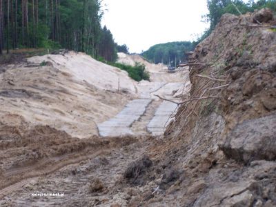 Droga technologiczna po drugiej stronie rowu sluzaca dojazdowi w miejsce, gdzie bedzie budowany most.
